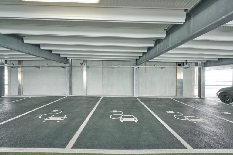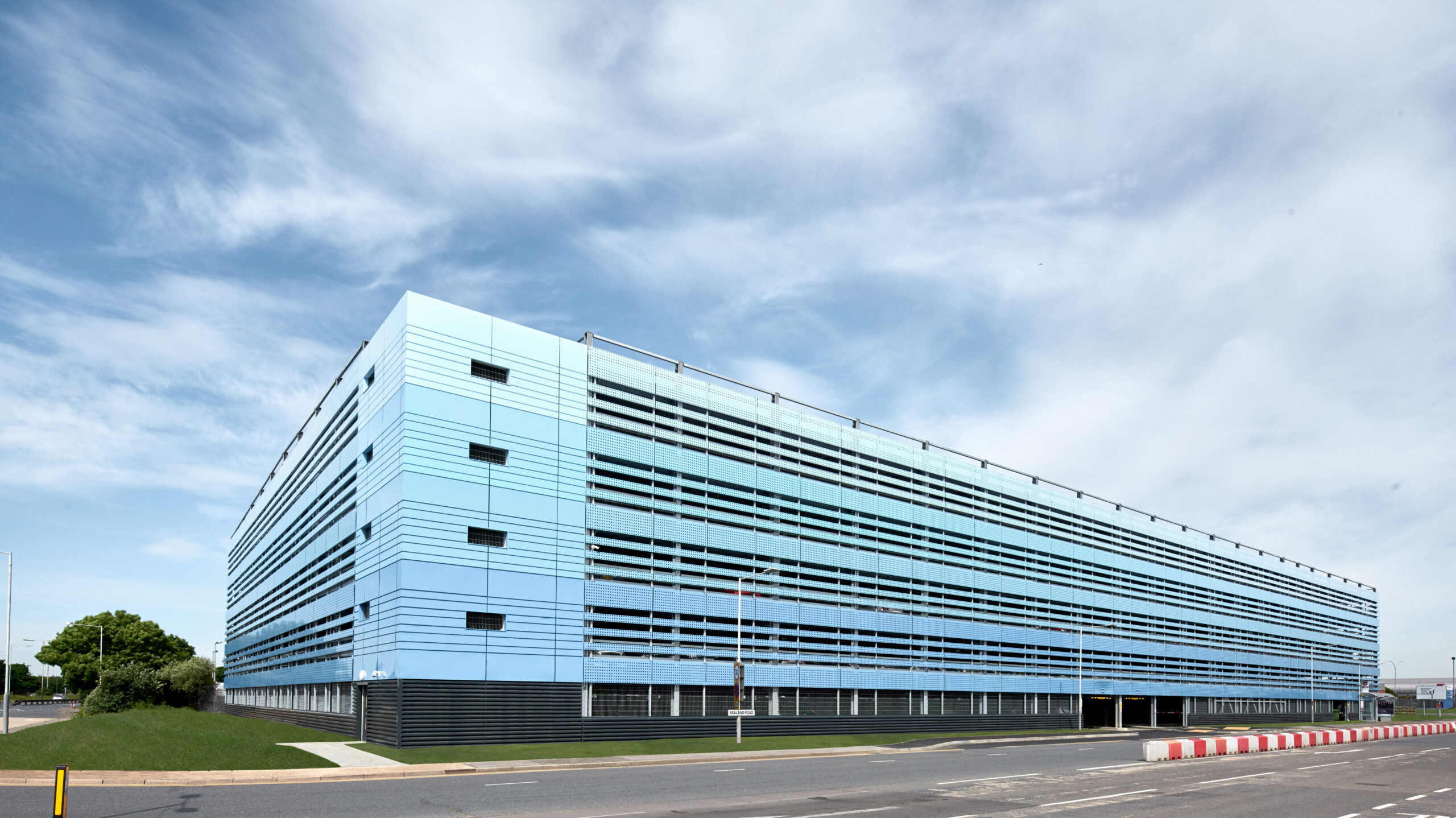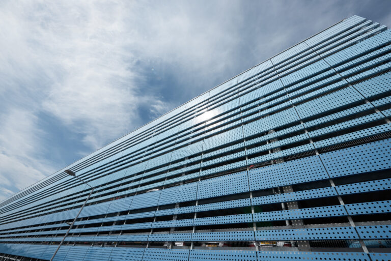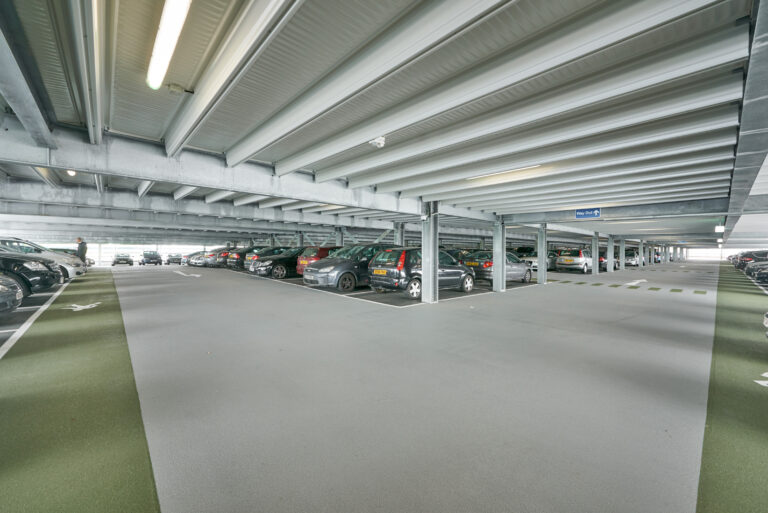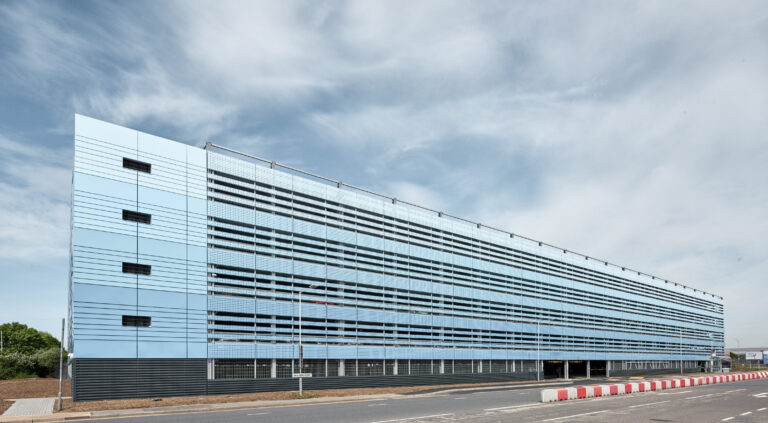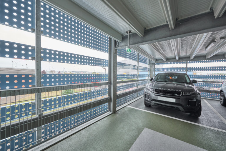 The car park is strategically located on the Heathrow Airport site, close to Terminal 4, making stakeholder coordination essential to the project’s success. The site is located above both the Piccadilly Line and the Heathrow Express Tunnel (HAL), requiring a unique construction solution. Huber Parking used shallow pad foundations, supported by finite element modelling techniques, which assured stakeholders of the suitability of the design. The tunnels below were fitted with monitoring equipment to track any movement during construction. Three staircases are fitted with fire-resistant steel doors with vision panels that are colour-coded to match the colour scheme of the protective waterproof coating on the parking decks while a lift completes the comfort features of this MSCP. Curtain wall windows in the main staircase provide natural daylight and perforated powder coated steel cladding strips meet ventilation requirements.