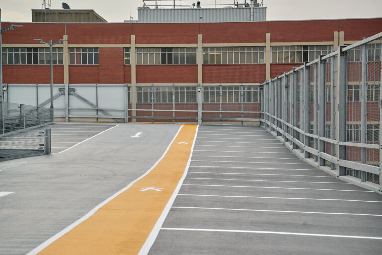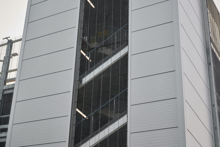 Delivered as a turnkey design-and-build project, the car park provides 389 standard bays, 21 disabled spaces and 18 bicycle bays. The decks are clad externally with galvanized linear mesh, while the stair cores feature fire-rated composite panels. An intelligent LED system ensures energy-efficient lighting. On the east elevation, a green wall system with integrated bird houses enhances the ecological value.