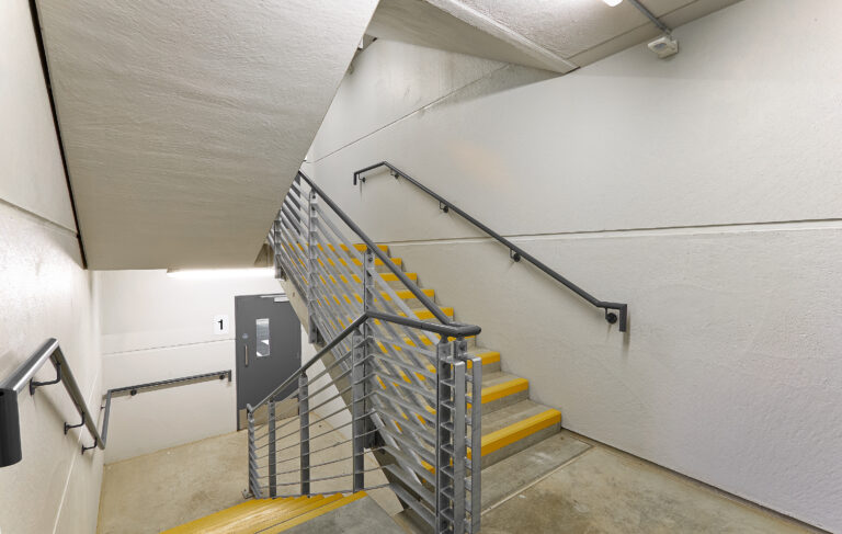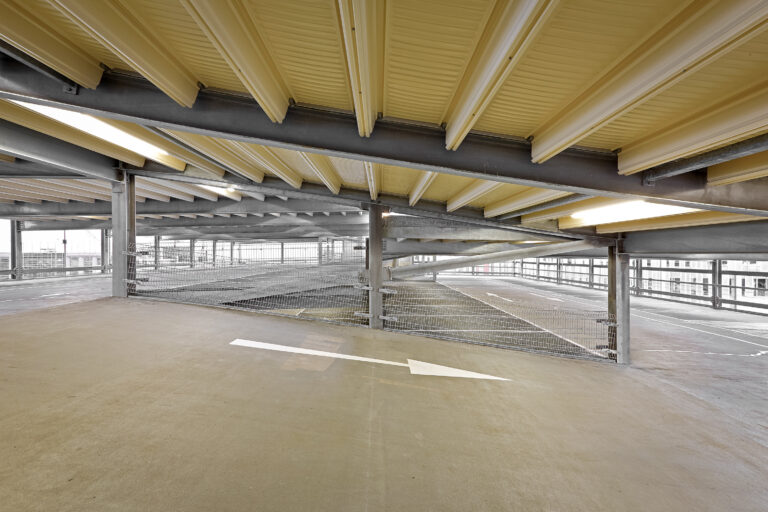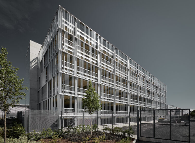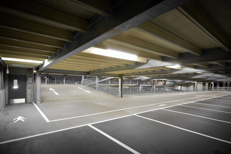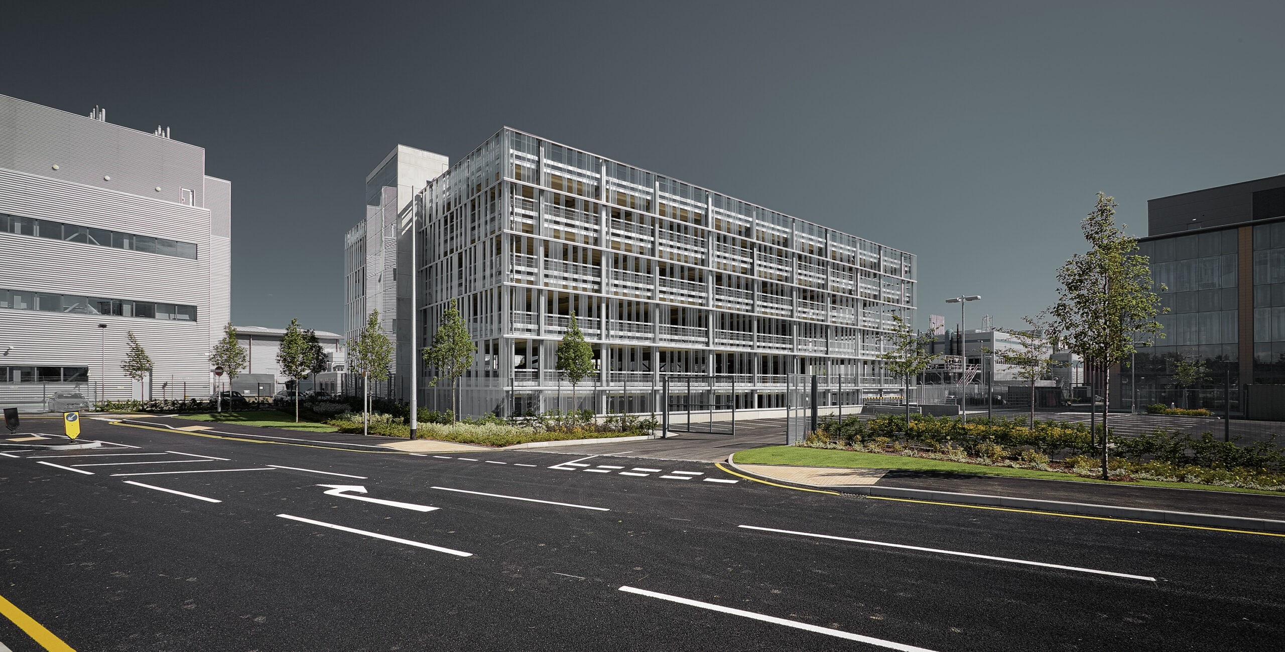 In April 2013, Huber Parking delivered a 325-space multi-storey staff car park for SEGRO at the Slough Trading Estate. The building features glass and metal cladding, complemented by a fully glazed staircase. The façade materials were chosen to harmonise with the surrounding buildings, creating a cohesive appearance across the campus.