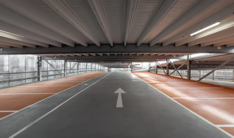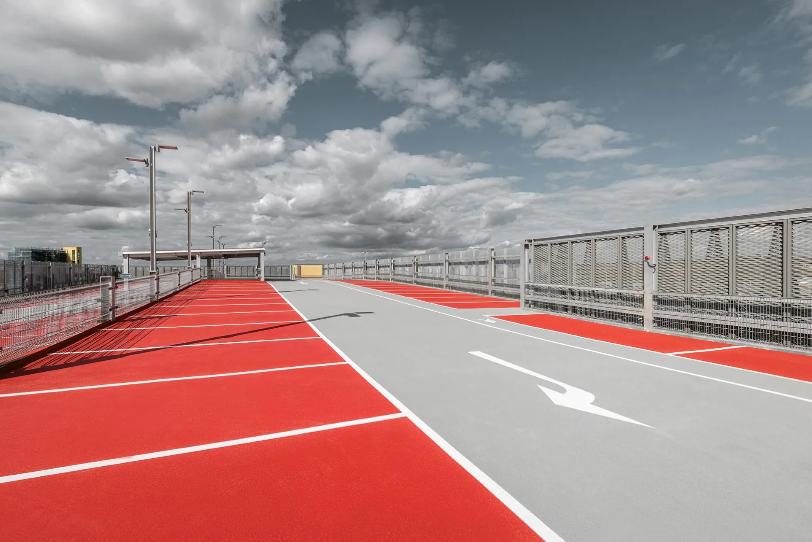 Colour carpets separate lanes and parking spaces visually.