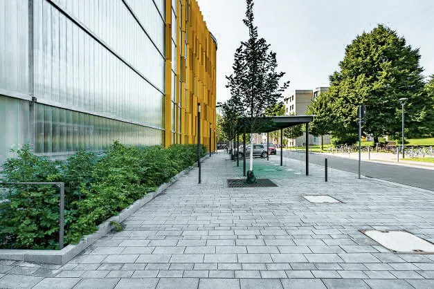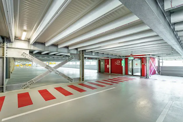Das Parkhaus verfügt über ein effizientes Parkleitsystem mit Rot-Grün-Ampel, das geschossweise freie Stellplätze anzeigt. Dieses System, kombiniert mit speziellen Verkehrsflächen, ermöglicht eine einfache Verkehrsabwicklung und reduziert den CO2-Ausstoß für eine umweltfreundlichere Mobilität. Zudem stehen 16 E-Ladeplätze zur Verfügung, die schrittweise auf 48 Stück erweitert werden können.