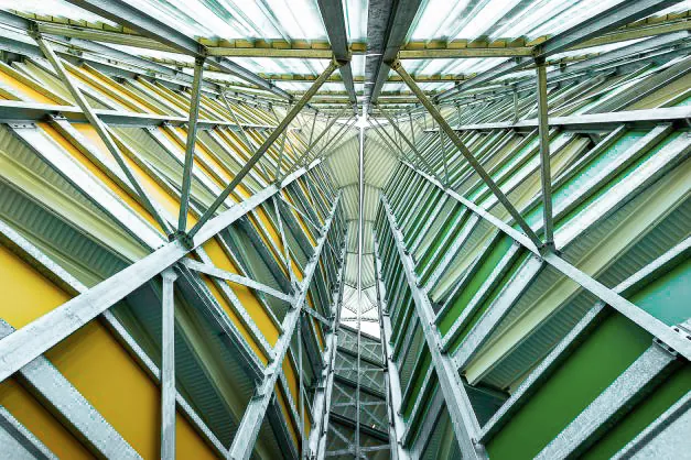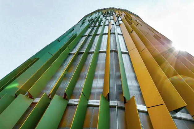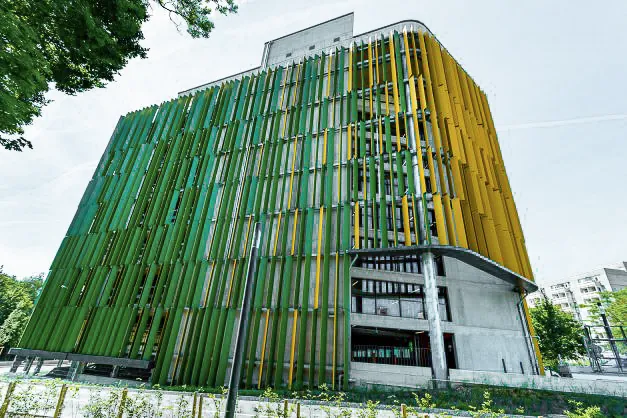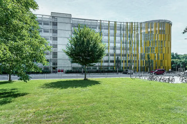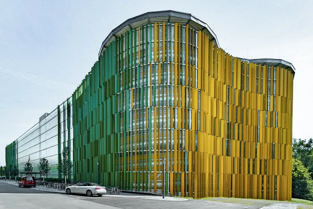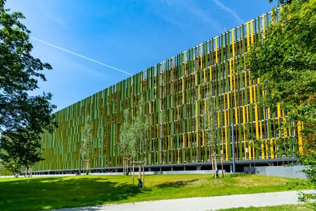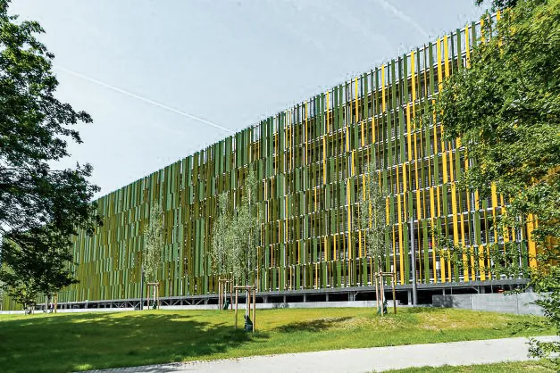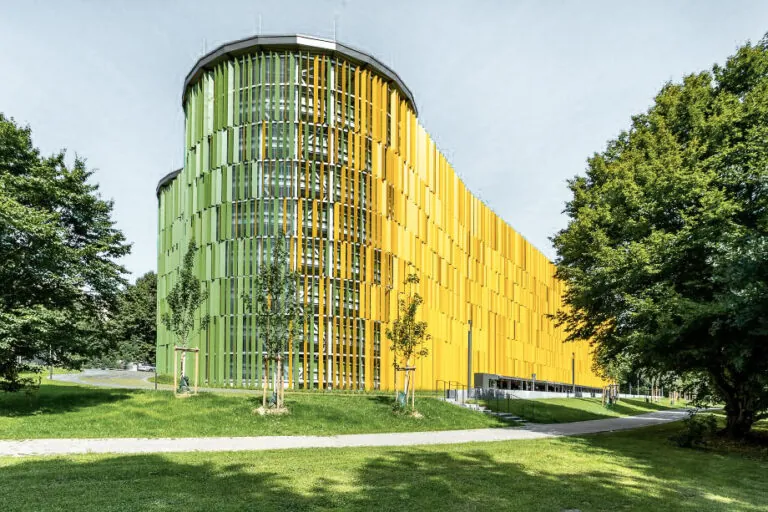 Die Fassade, entworfen von Nebel Pössel Architekten GmbH, kombiniert Ästhetik mit Funktionalität. Die zweischichtige Profilglasfassade senkt den Schalldruckpegel um mindestens 20dB, was einen effektiven Lärmschutz für die umliegenden Wohnheime bedeutet. Vertikal ausgerichtet und unterschiedlich geneigte pulverbeschichteten Fassadensegel in sattem Gelb und Grün verleihen der Gebäudehülle des großen Baukörpers einen eigenständigen Charakter. In Richtung Westen ergänzt eine zweite Fassadenschicht aus unterliegenden Glaselementen insbesondere die beiden großen Rampentürme.