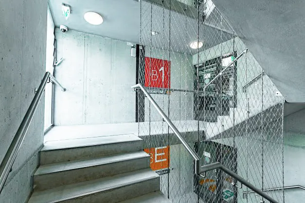 Das Parkhaus bietet zwei helle, verglaste Treppenhäuser und drei barrierefreie Aufzüge, von denen zwei für den Transport von Krankentragen geeignet sind. Die Sicherheit wird durch eine einheitliche Sicherheitsbeleuchtung, flächendeckende Videoüberwachung und eine umfassende CO-Warnanlage gewährleistet. Letztere kann die Kohlenmonoxidkonzentration konsistent nachvollziehen und damit den sicheren Betreib gewährleisten. Durch eine flächendeckende Brandmeldeanlage und die Belüftung über die Fassaden ist der Brandschutz gewährleistet